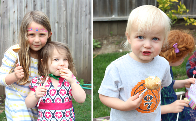 We wanted to keep it simple with a few neighborhood friends, some face painting, and lots of food on sticks! We bought a bunch of lollipop sticks from a kitchen supply store and served all of our appetizers lollipop style.