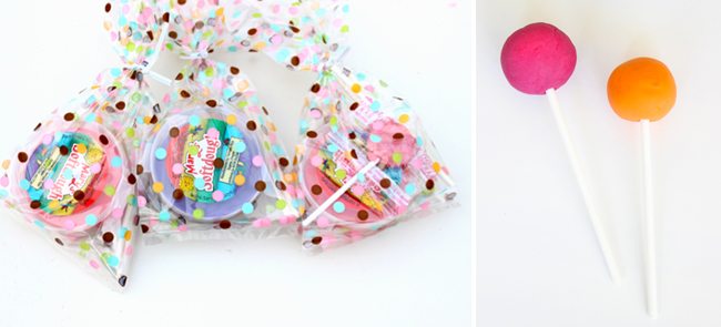 One of the activities at the party was making lollipops out of play dough and sticks. We extended this activity by offering the kids goodie bags filled with play dough, sticks, and a lollipop for good measure.